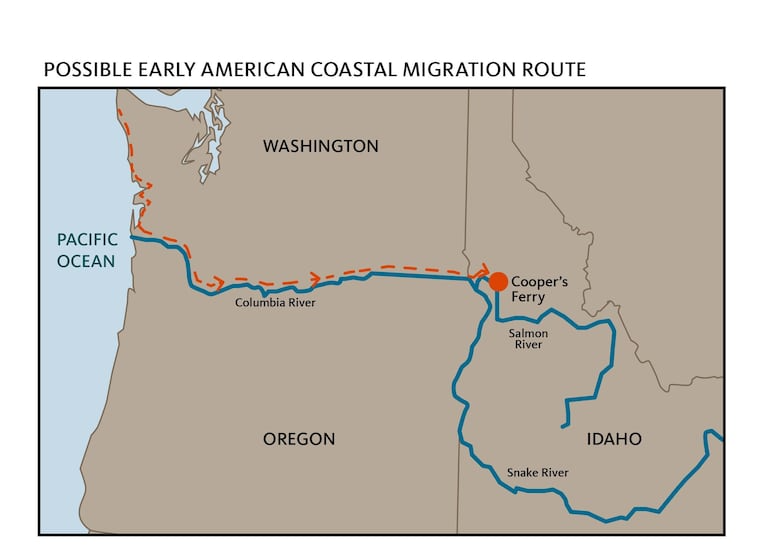 In Douglas Main’s article First People in the Americas Came by Sea, Ancient Tools Unearthed by Idaho River Suggest, published on Science.org, researchers excavating the Cooper’s Ferry site along Idaho’s Salmon River found stone tools, hearths, and butchered animal bones dating to roughly 16,000 years ago. Loren Davis, an archaeologist at Oregon State University and project lead for the Cooper’s Ferry site, notes that the site’s location supports a “coastal migration” hypothesis. The site is situated more than 500 kilometers inland, but connected by the Salmon, Snake, and Columbia rivers to the Pacific. These early peoples likely followed waterways southward along the Pacific coast, long before the inland ice-free corridor opened through Canada roughly 14,800 years ago.
